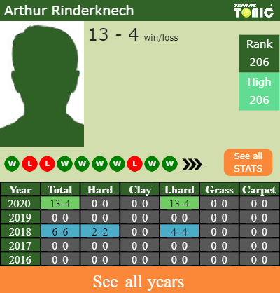 Rinderknech has a losing win-loss record in the last 5 years having won 29% of his matches (77-32). 13-4 on indoor hard courts in 2020. Regarding his performance on the same surface of this event, Rinderknech has a 19-10 record in the last 5 years on indoor hard courts.