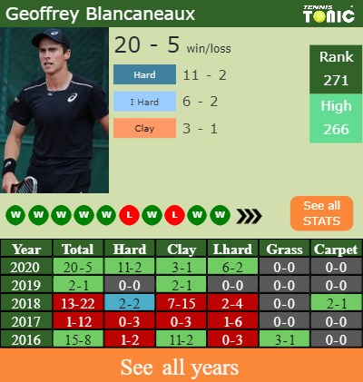 Blancaneaux has a winning win-loss record in the last 5 years having won 51% of his matches (38-37). 6-2 on indoor hard courts in 2020. In connection with his performance on the same surface of this event, Blancaneaux has a 51-48 win-loss record in the last 5 years on indoor hard courts.