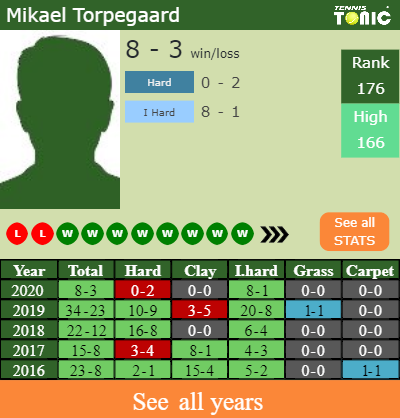 Torpegaard has a fantastic win-loss record in the last 6 years having won 72% of his matches (237-93). 8-1 on indoor hard courts in 2020. Regarding his performance on the same surface of this tournament, Torpegaard has a 102-54 win-loss record in the last 6 years on indoor hard courts.