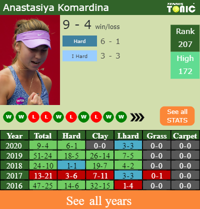 Komardina has a winning record in the last 8 years having won 53% of her matches (116-102). 3-3 on indoor hard courts in 2020. In connection with her performance on the same surface of this competition, Komardina has a 152-91 win-loss record in the last 8 years on indoor hard courts.