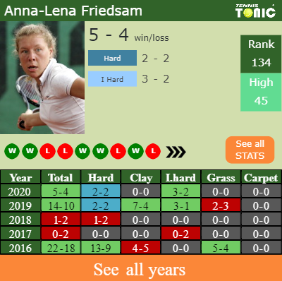 Anna-Lena has a 5-4 win-loss record in 2020, 3-2 on indoor hard courts (See FULL STATS).
