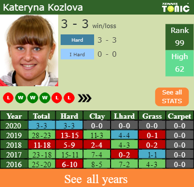 Kozlova has a 3-3 win-loss record in 2020, 3-3 on hard (See FULL STATS).