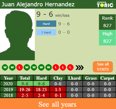 Alejandro has a 9-6 win-loss record in 2020, 9-6 on hard (See FULL STATS).