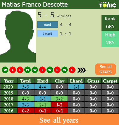 The Argentine has a 5-5 win-loss record in 2020, 4-4 on hard (See FULL STATS).