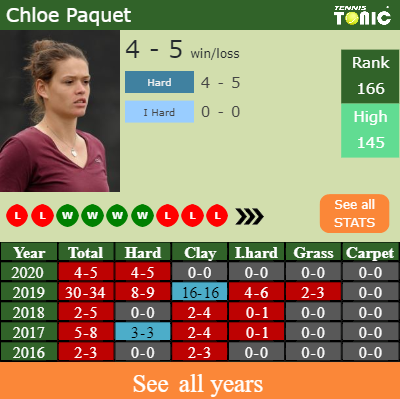 Chloe has a 4-5 win-loss record in 2020, 0-0 on indoor hard courts (See FULL STATS).