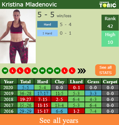 Kristina has a 5-5 win-loss record in 2020, 0-1 on indoor hard courts (See FULL STATS).