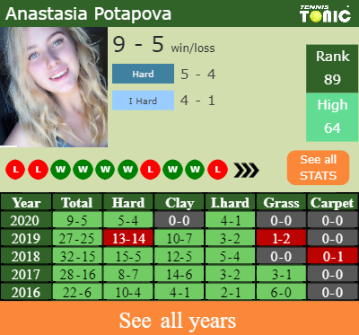 Anastasia has a 9-5 win-loss record in 2020, 5-4 on hard (See FULL STATS).