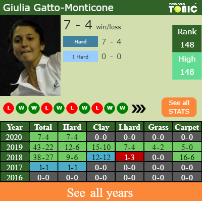 Gatto-Monticone has a solid record in the last 9 years having won 63% of her matches (269-158). 7-4 on hard in 2020. Talking about her performance on the same surface of this competition, Gatto-Monticone has a 95-61 win-loss record in the last 9 years on hard.