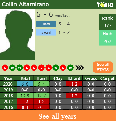 Altamirano has a winning win-loss record in the last 8 years having won 56% of his matches (127-101). 5-4 on hard in 2020. Regarding his performance on the same surface of this event, Altamirano has a 30-33 win-loss record in the last 8 years on hard.