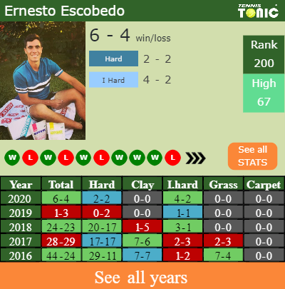 Ernesto has a 6-4 win-loss record in 2020, 2-2 on hard (See FULL STATS).