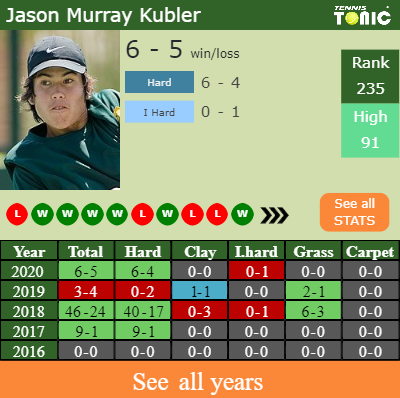 Murray Kubler has a solid win-loss record in the last 10 years having won 68% of his matches (443-206). 6-4 on hard in 2020. Talking about his performance on the same surface of this tournament, Murray Kubler has a 117-70 record in the last 10 years on hard.