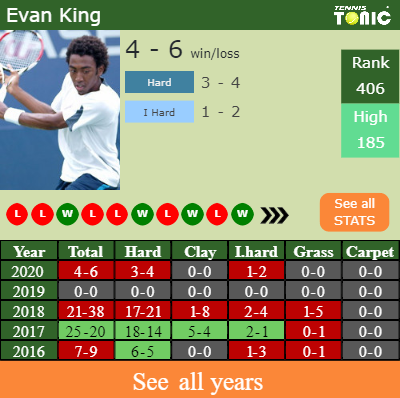 King has a negative win-loss record in the last 10 years having won 47% of his matches (347-389). 3-4 on hard in 2020. Regarding his performance on the same surface of this event, King has a 79-100 record in the last 10 years on hard.