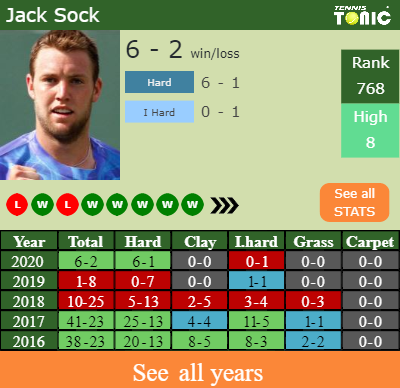 Sock has a winning record in the last 10 years having won 54% of his matches (609-514). 6-1 on hard in 2020. Talking about his performance on the same surface of this tournament, Sock has a 242-185 record in the last 10 years on hard.