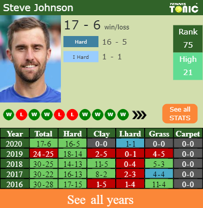 Johnson has a positive record in the last 10 years having won 59% of his matches (966-666). 16-5 on hard in 2020. Talking about his performance on the same surface of this competition, Johnson has a 293-213 win-loss record in the last 10 years on hard.