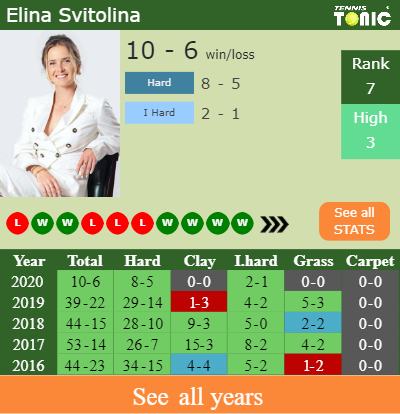 Svitolina has a solid record in the last 10 years having won 69% of her matches (1277-579). 8-5 on hard in 2020. Regarding her performance on the same surface of this tournament, Svitolina has a 384-194 record in the last 10 years on hard.