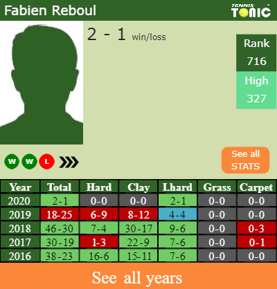 Reboul has a 2-1 win-loss record in 2020, 0-0 on hard (See FULL STATS).
