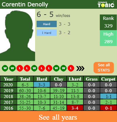 Denolly has a 6-5 win-loss record in 2020, 3-3 on hard (See FULL STATS).