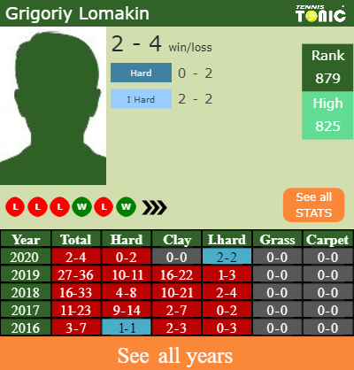 Lomakin has a 2-4 win-loss record in 2020, 2-2 on indoor hard courts (See FULL STATS).