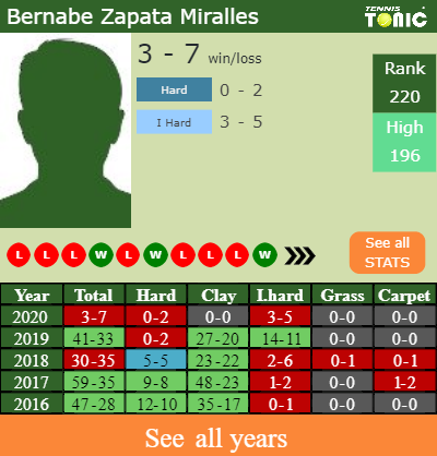 Zapata Miralles has a negative win-loss record in the last 6 years having won 46% of his matches (100-119). 3-5 on indoor hard courts in 2020. In connection with his performance on the same surface of this competition, Zapata Miralles has a 221-163 win-loss record in the last 6 years on indoor hard courts.