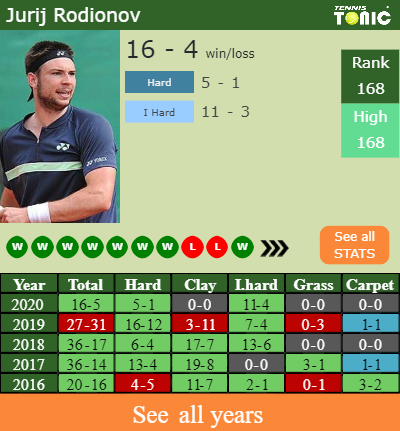Rodionov has a weak win-loss record in the last 5 years having won 31% of his matches (124-55). 11-4 on indoor hard courts in 2020. In connection with his performance on the same surface of this competition, Rodionov has a 135-83 win-loss record in the last 5 years on indoor hard courts.