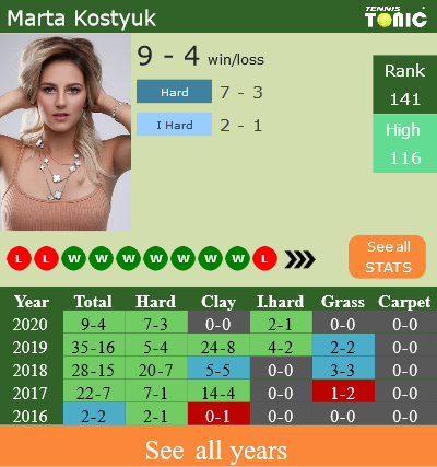 The Ukrainian has a 9-4 win-loss record in 2020, 0-0 on clay (See FULL STATS).