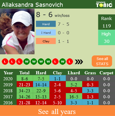 Aliaksandra has a 8-6 win-loss record in 2020, 1-1 on clay (See FULL STATS).