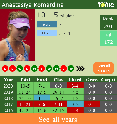 The Russian has a 10-5 win-loss record in 2020, 0-0 on clay (See FULL STATS).