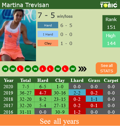 Trevisan has a solid win-loss record in the last 7 years having won 69% of her matches (1060-479). 1-0 on clay in 2020. Regarding her performance on the same surface of this event, Trevisan has a 188-99 win-loss record in the last 7 years on clay.