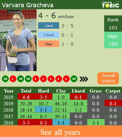Gracheva has a losing record in the last 5 years having won 23% of her matches (316-96). 1-0 on clay in 2020. Talking about her performance on the same surface of this competition, Gracheva has a 141-67 record in the last 5 years on clay.