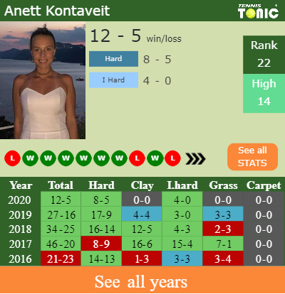 The Estonian has a 12-5 win-loss record in 2020, 0-0 on clay (See FULL STATS).