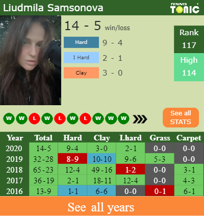 Samsonova has a solid win-loss record in the last 5 years having won 68% of her matches (244-116). 3-0 on clay in 2020. Regarding her performance on the same surface of this tournament, Samsonova has a 160-84 record in the last 5 years on clay.
