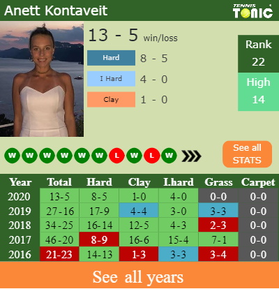 Kontaveit has a 13-5 win-loss record in 2020, 1-0 on clay (See FULL STATS).