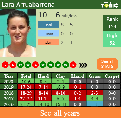 Lara has a 10-6 win-loss record in 2020, 2-1 on clay (See FULL STATS).