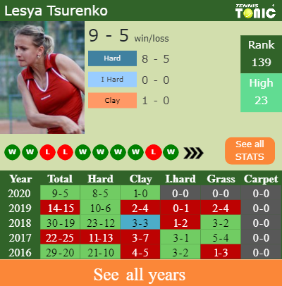 Lesya has a 9-5 win-loss record in 2020, 1-0 on clay (See FULL STATS).
