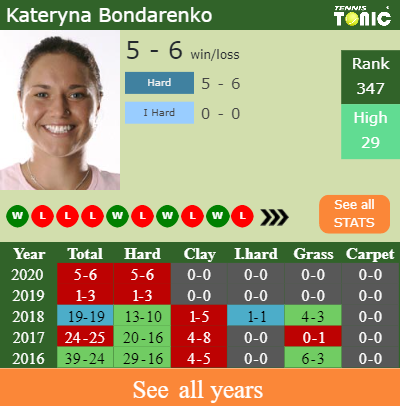 In terms of her career, Bondarenko has an overall 436-323 record. She has positive 244-169 record on hard.