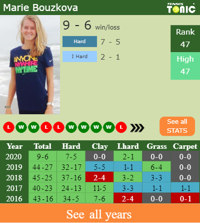 The Czech has a 9-6 win-loss record in 2020, 7-5 on hard (See FULL STATS).