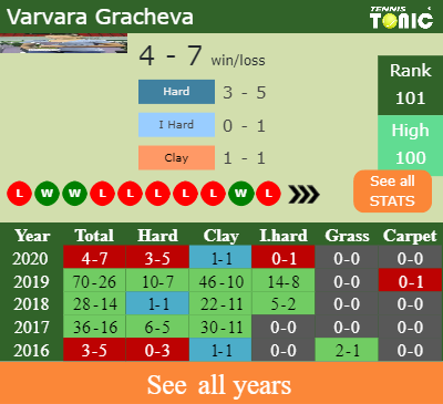In terms of her career, Gracheva has an overall 141-68 record. She has positive 100-34 record on clay.