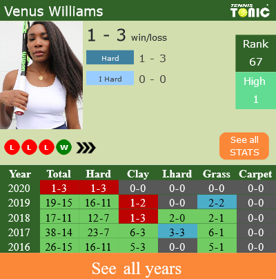 Venus Williams has a solid record in the last 10 years having won 66% of her matches (814-411). 1-3 on hard in 2020. In connection with her performance on the same surface of this competition, Venus Williams has a 225-109 record in the last 10 years on hard.