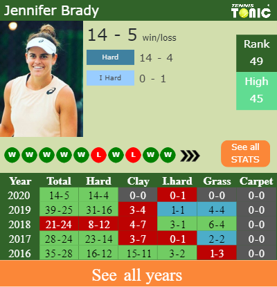 Brady has a solid win-loss record in the last 7 years having won 63% of her matches (861-500). 14-4 on hard in 2020. In connection with her performance on the same surface of this competition, Brady has a 221-151 win-loss record in the last 7 years on hard.