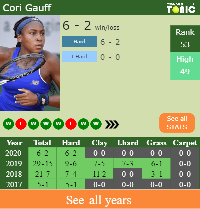 Gauff has a solid win-loss record in the last 4 years having won 67% of her matches (70-35). 6-2 on hard in 2020. Regarding her performance on the same surface of this tournament, Gauff has a 61-25 win-loss record in the last 4 years on hard.