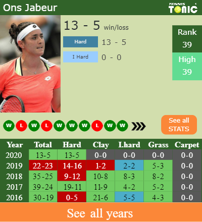 Jabeur has a 13-5 win-loss record in 2020, 13-5 on hard (See FULL STATS).