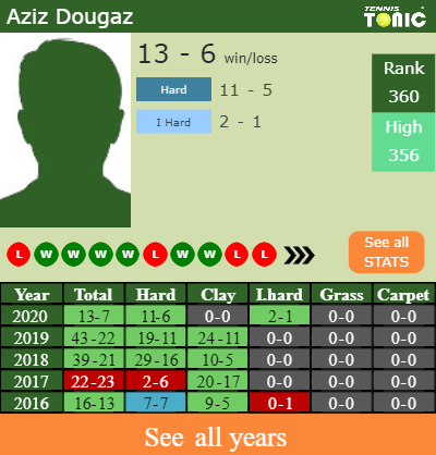 Dougaz has a 13-7 win-loss record in 2020, 0-0 on clay (See FULL STATS).