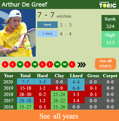 De Greef has a 7-7 win-loss record in 2020, 0-0 on clay (See FULL STATS).