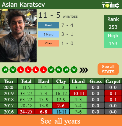 Karatsev has a winning win-loss record in the last 9 years having won 57% of his matches (545-415). 1-0 on clay in 2020. Talking about his performance on the same surface of this event, Karatsev has a 293-203 record in the last 9 years on clay.