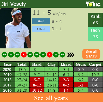 Vesely has a 13-5 win-loss record in 2020, 2-0 on clay (See FULL STATS).