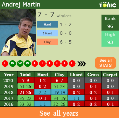 Martin has a 7-9 win-loss record in 2020, 1-2 on hard (See FULL STATS).