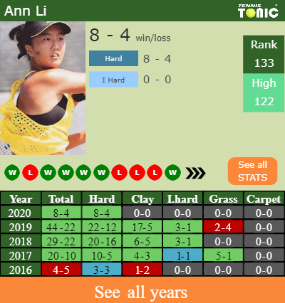 Ann has a 8-4 win-loss record in 2020, 8-4 on hard (See FULL STATS).