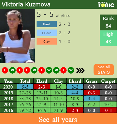 Kuzmova has a 5-5 win-loss record in 2020, 2-3 on hard (See FULL STATS).