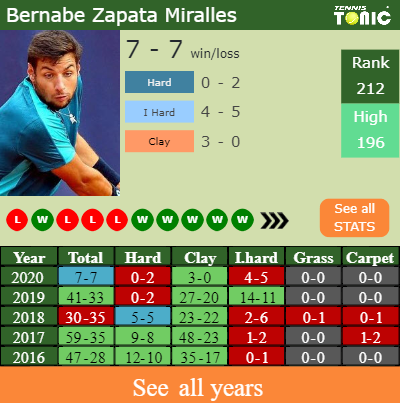 Zapata Miralles has a solid record in the last 6 years having won 62% of his matches (489-305). 3-0 on clay in 2020. In connection with his performance on the same surface of this event, Zapata Miralles has a 225-163 record in the last 6 years on clay.