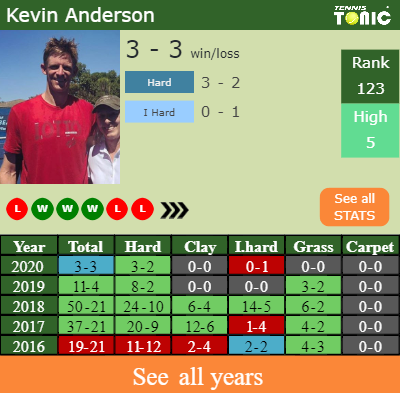 Kevin has a 3-3 win-loss record in 2020, 3-2 on hard (See FULL STATS).
